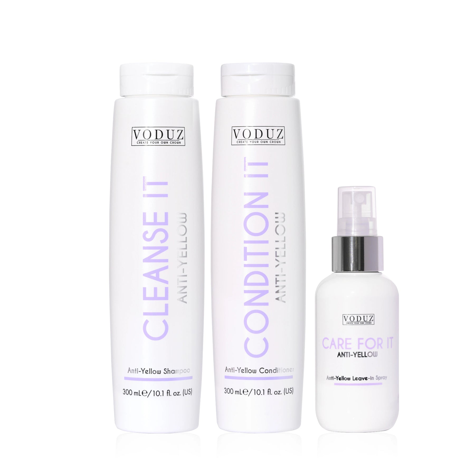This exclusive launch bundle includes our new Anti-Yellow Shampoo, Conditioner, and Leave-In Spray, formulated with violet pigment and nourishing oils to keep your blonde looking fresh, soft, and radiant between salon visits.