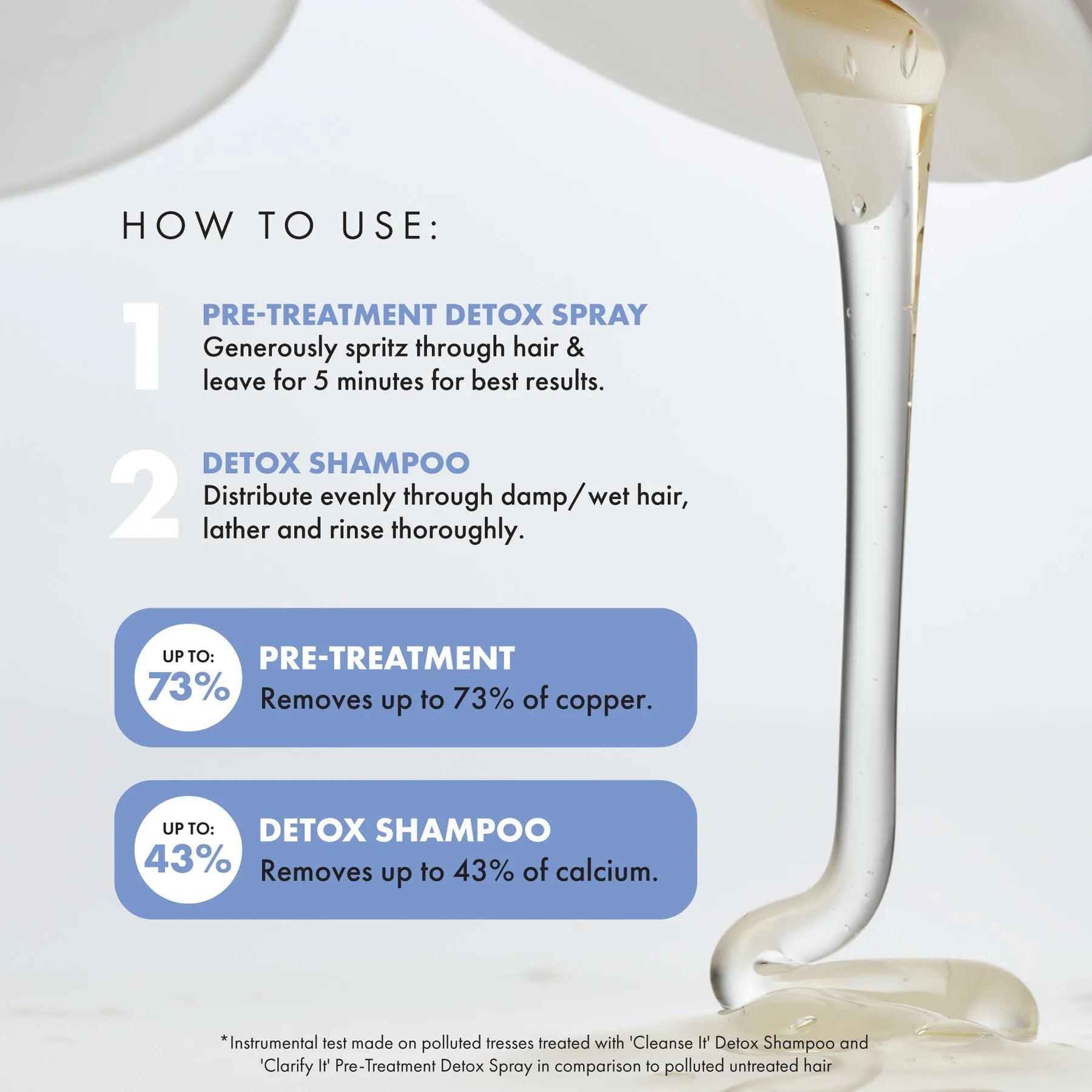 *Instrumental test made on polluted tresses treated with 'Cleanse It' Detox Shampoo and 'Clarify It' Pre-Treatment Detox Spray in comparison to polluted untreated hair.